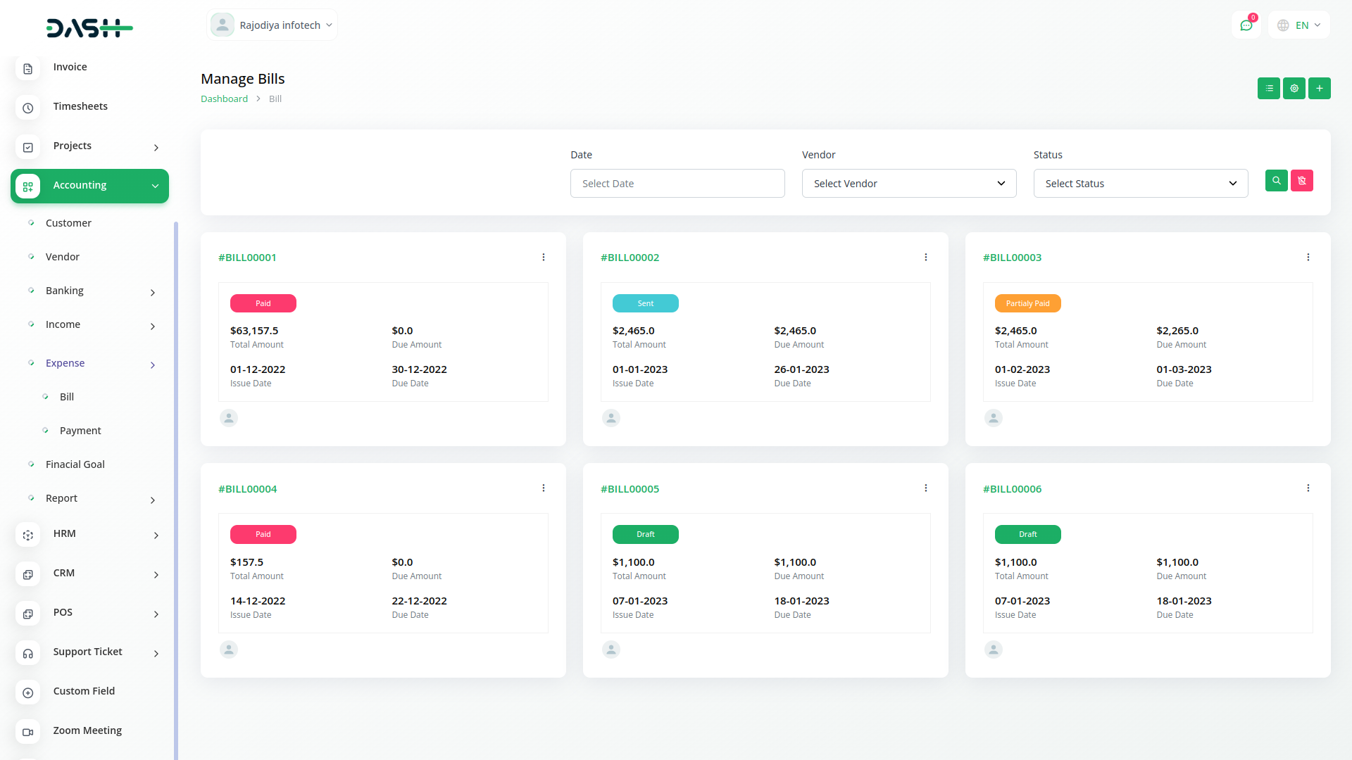 A budget is a financial plan for a specified period to keep in check with the working capital. This feature here helps to maintain the capital flow. You can set monthly, quarterly, half-yearly, or yearly budgets according to your business plans and needs. The main categories are “Income” and “Expense” where one can edit /update /delete the sub-categories as well.